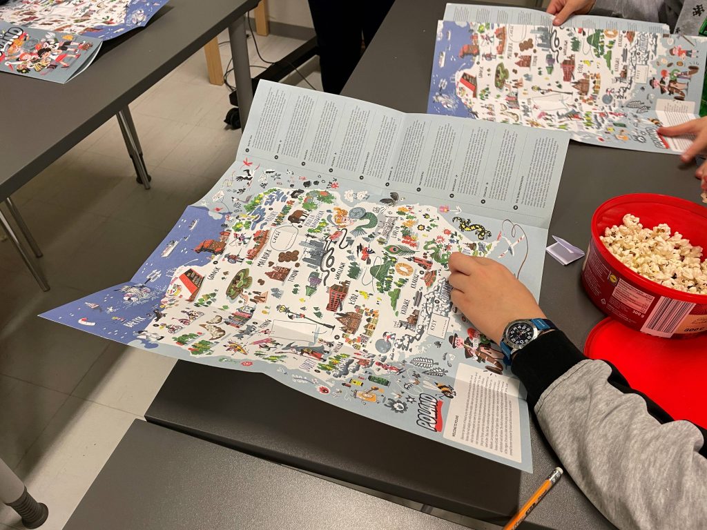 Program warsztatów łączył elementy edukacji geograficznej, językowej i kulturowej, a jego interaktywna forma sprzyjała aktywnemu uczestnictwu. Różnorodne metody pracy – od quizów i gier edukacyjnych, przez słuchanie legend, aż po działania plastyczne – sprawiły, że każde spotkanie było pełne zaangażowania, ciekawości i radości odkrywania.
