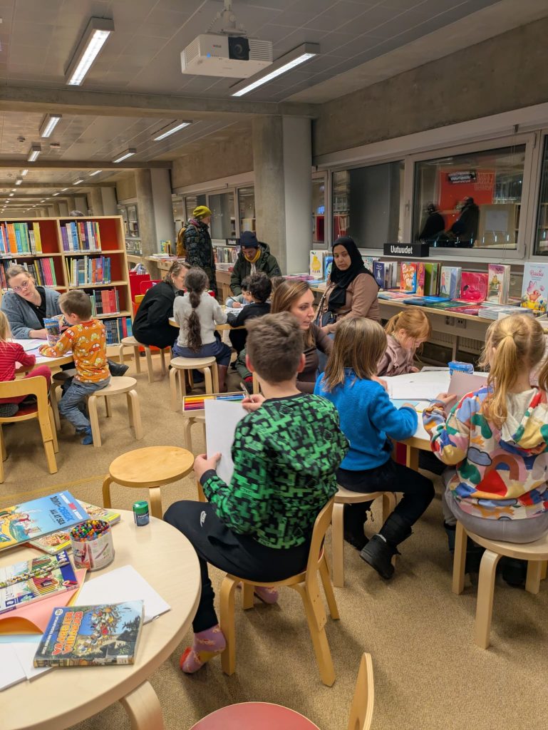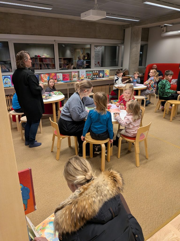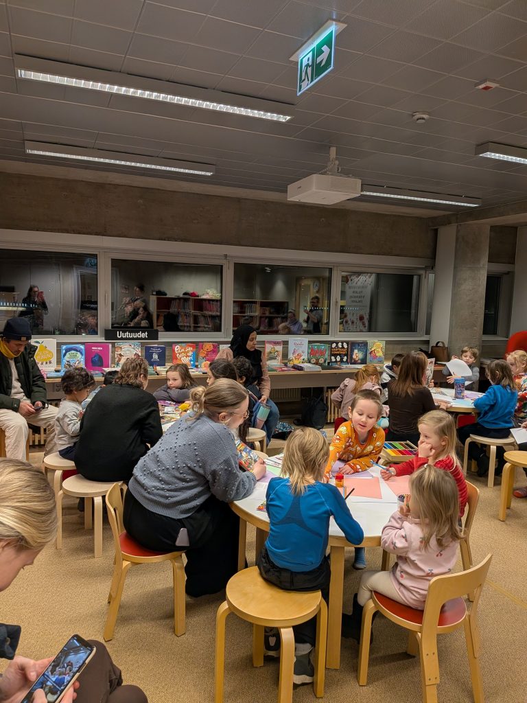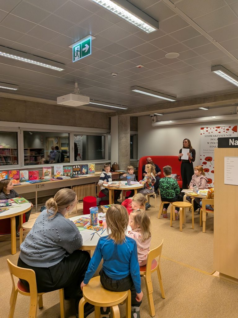 The Association of Poles in Northern Finland prepared Polish and English translations of the story “A Colourful Day of the Moomins” by Tuula Korolainen. After a short introduction, the participants were divided into language groups according to the children’s preferences. Our wonderful volunteers – Anastazja, Sandra and Iina – read the beginning of the Moomin story to the children.