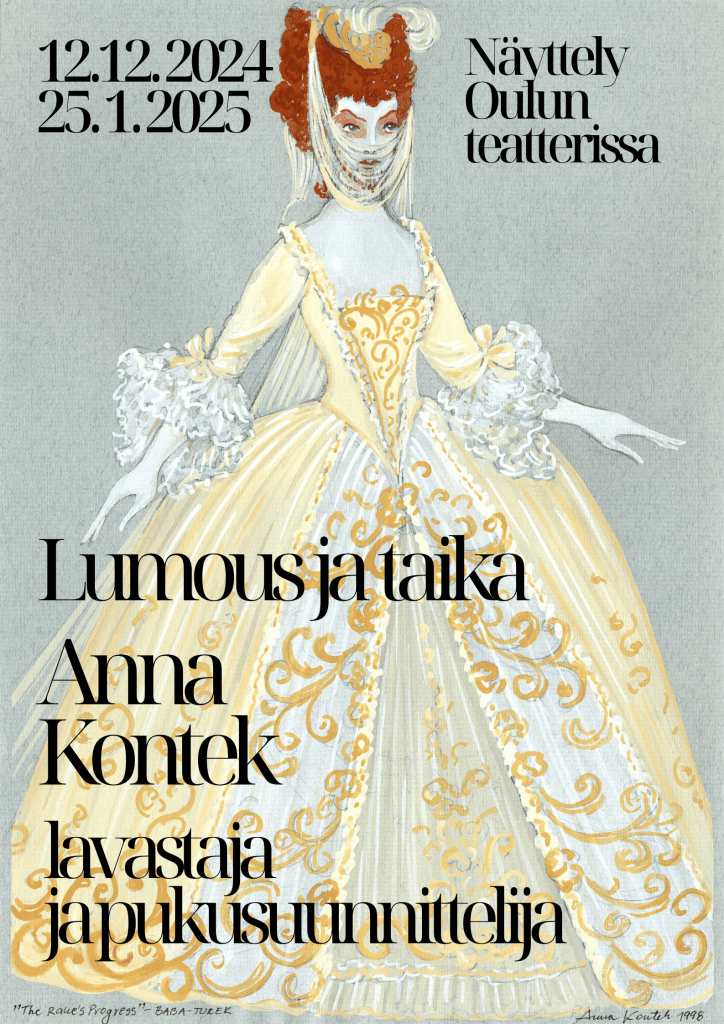 Lumous ja taika. Anna Kontek: lavastaja ja pukusuunnittelija -näyttely esittelee Anna Kontekin suunnittelemia pukuluonnoksia, lavasteita ja pukuja oopperaan Hulttion tie Oulun teatterissa. (Igor Stravinskyn Hulttion tie, ohjaus Leena Salonen, 1998.)