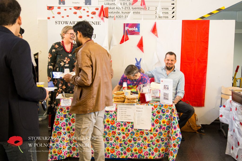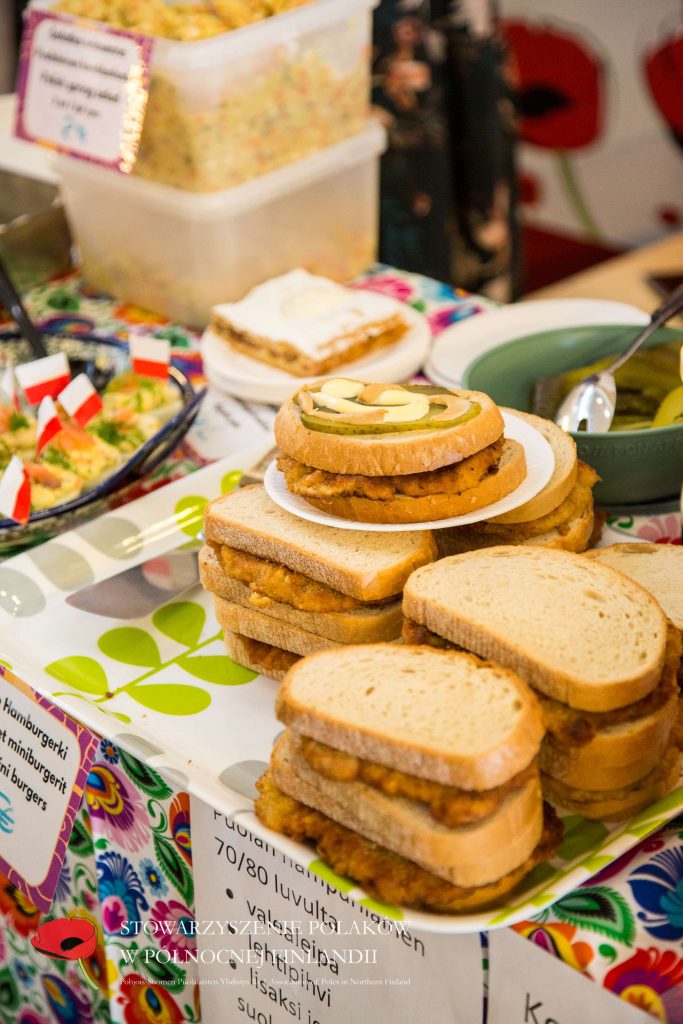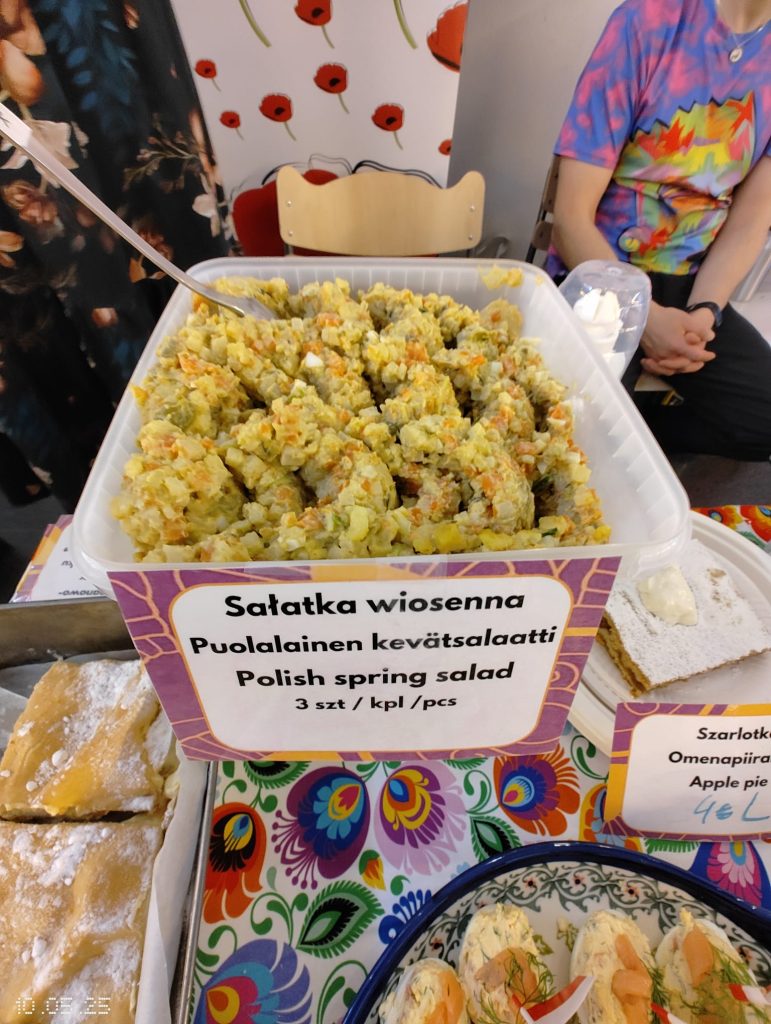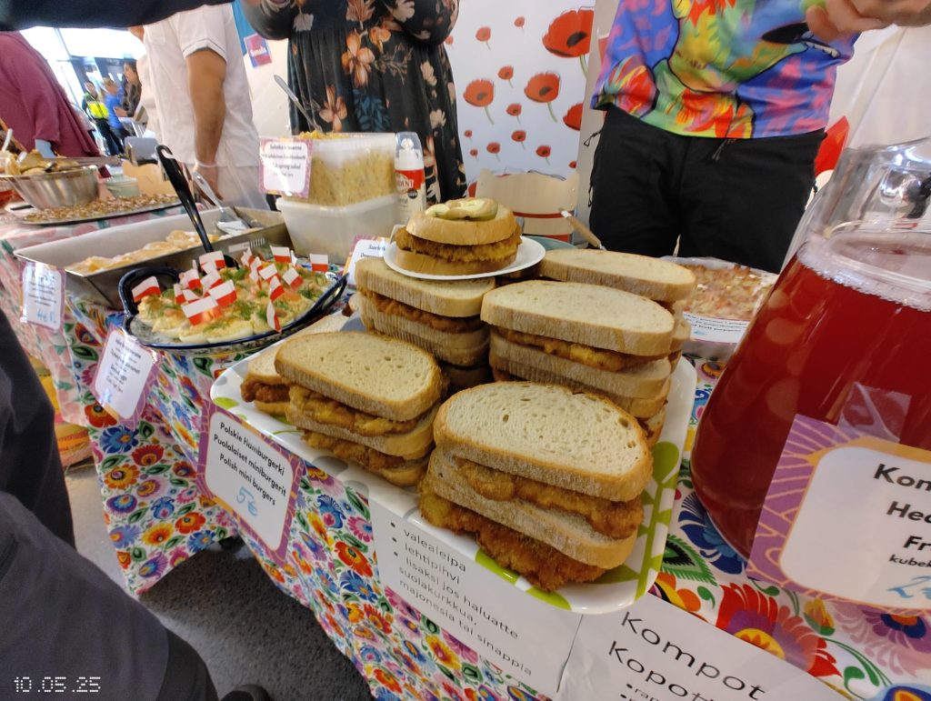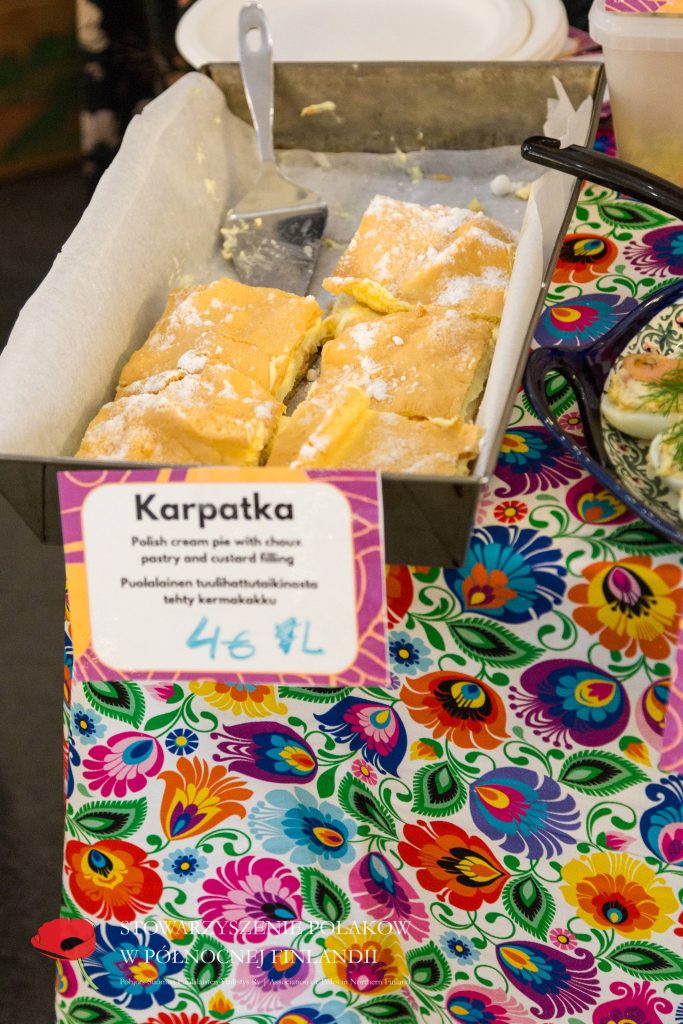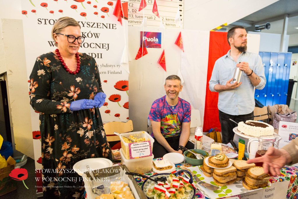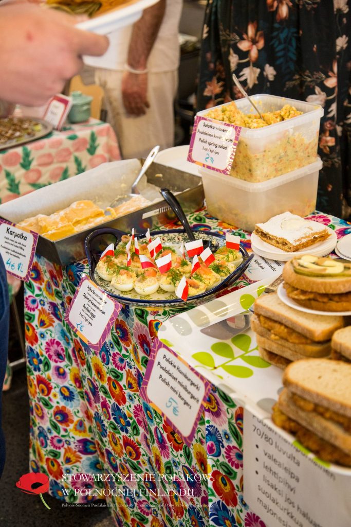 Puolalainen ruokapöytämme oli jälleen kerran täynnä herkullisia kotitekoisia ruokia ja leivonnaisia. Tuttujen ja suosittujen täytettyjen munien, kasvisalaatin ja omenapiirakan lisäksi tarjolla oli myös uutuuksia – kuten karpatka-kakkua, hedelmäkompottia, banaanikakkua ja yleisön ehdoton suosikki: puolalaiset ”hampurilaiset” leivitetyllä porsaankyljellä (schabowy)!