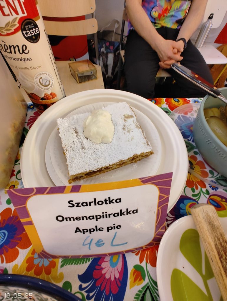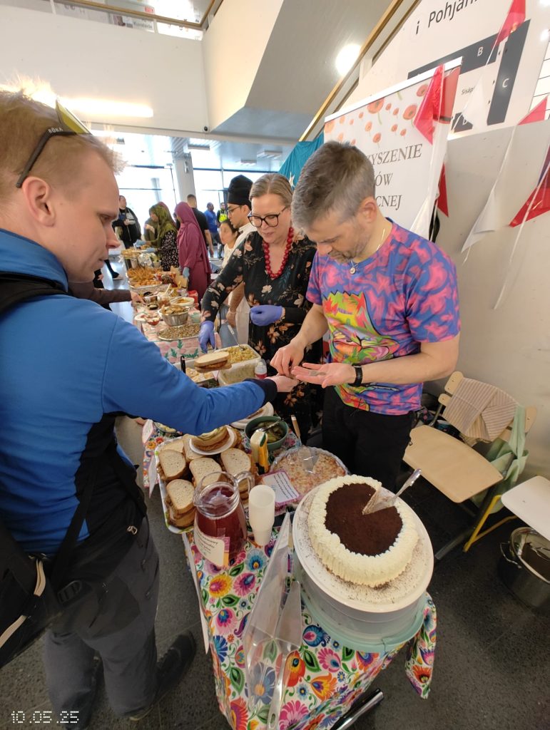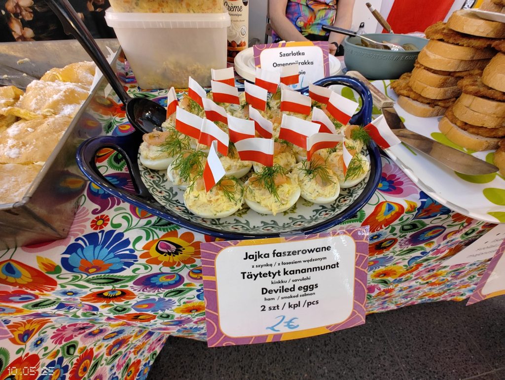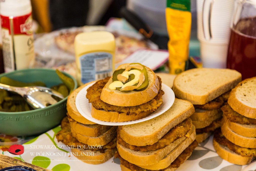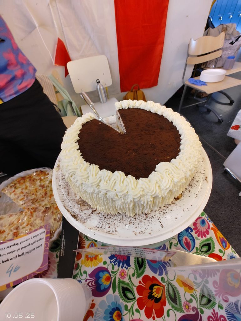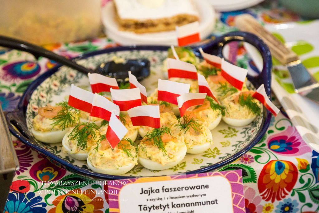 Puolalainen ruokapöytämme oli jälleen kerran täynnä herkullisia kotitekoisia ruokia ja leivonnaisia. Tuttujen ja suosittujen täytettyjen munien, kasvisalaatin ja omenapiirakan lisäksi tarjolla oli myös uutuuksia – kuten karpatka-kakkua, hedelmäkompottia, banaanikakkua ja yleisön ehdoton suosikki: puolalaiset ”hampurilaiset” leivitetyllä porsaankyljellä (schabowy)!